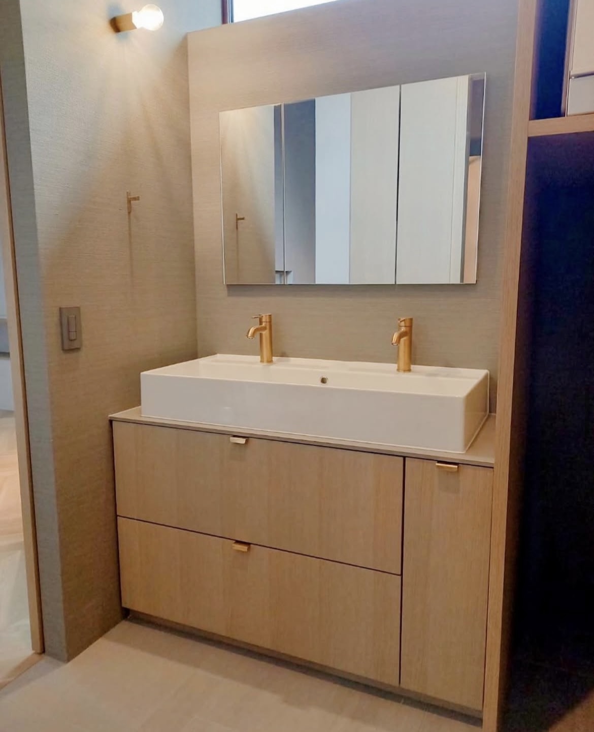 木目と真鍮が彩るホテルライク造作ダブルシンク洗面台。