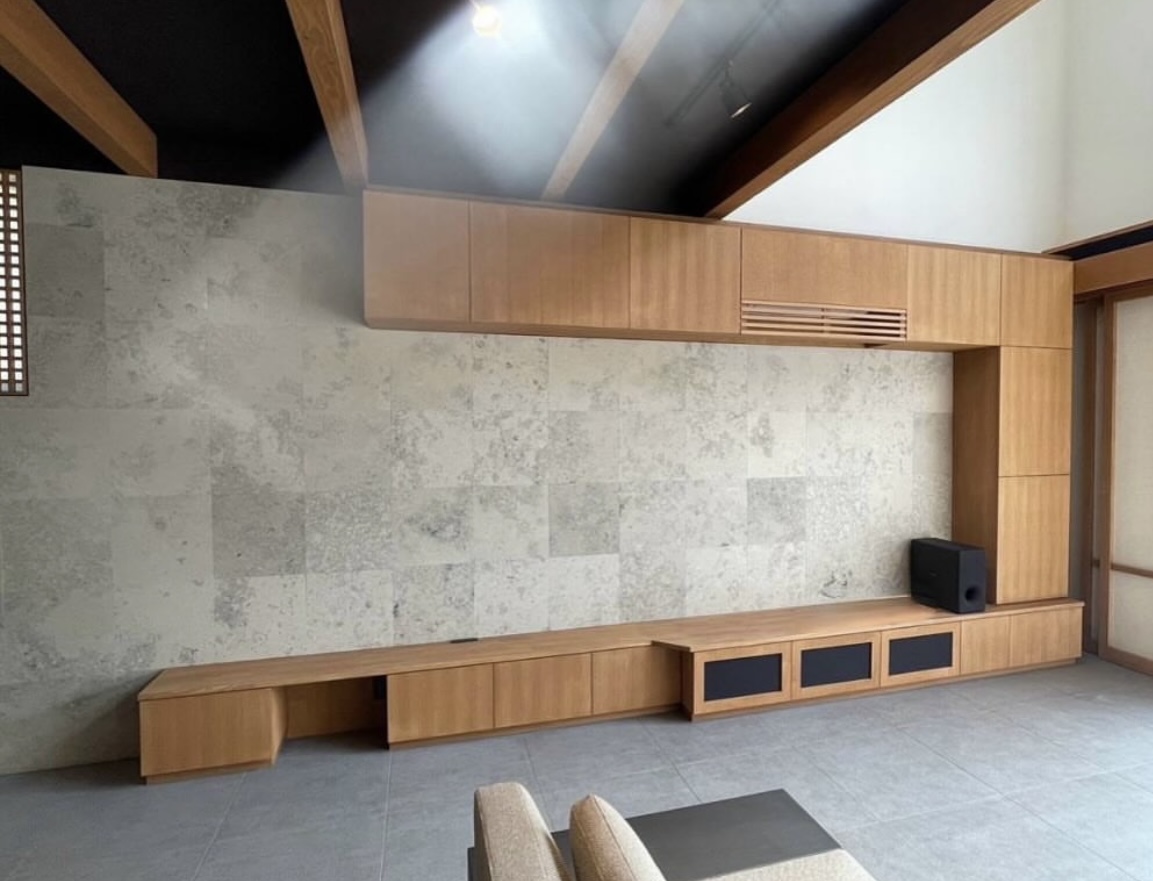生活感を隠して魅せる、壁一面を使ったゆとりを生むTV台収納家具。