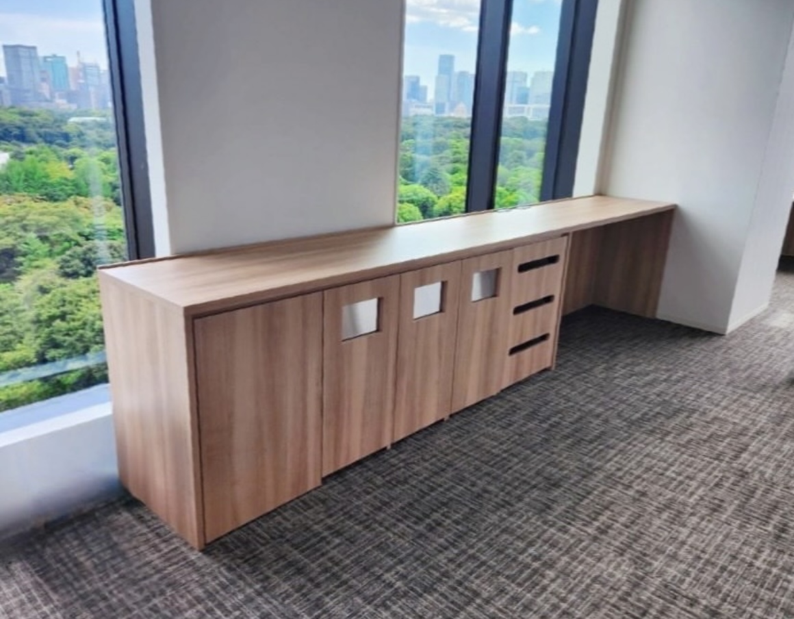 眺望と調和する窓際カウンター収納。