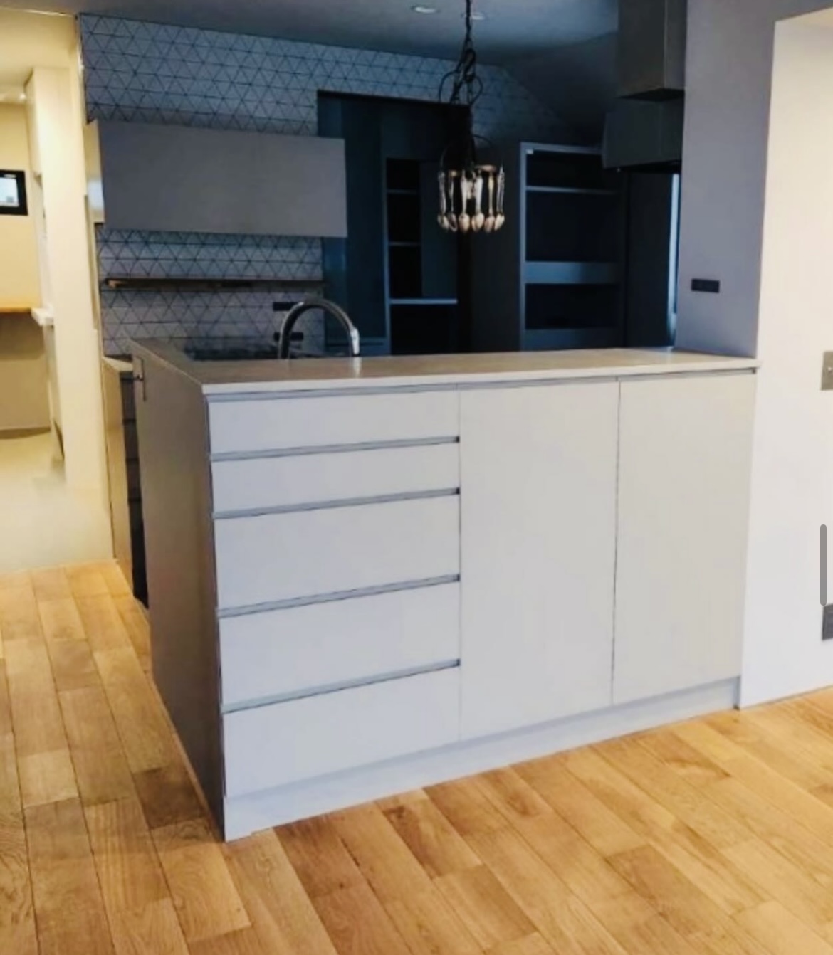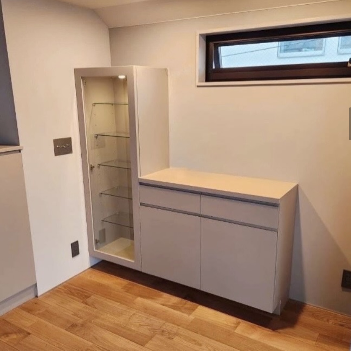 カウンターキッチン収納家具&照明付きガラス扉収納家具でディスプレイの楽しみも。