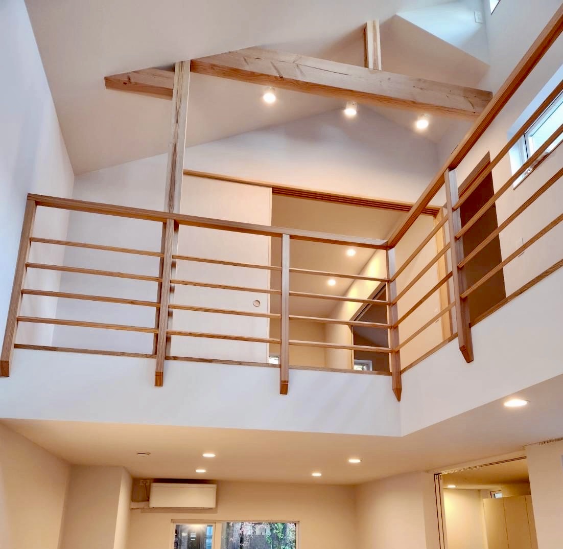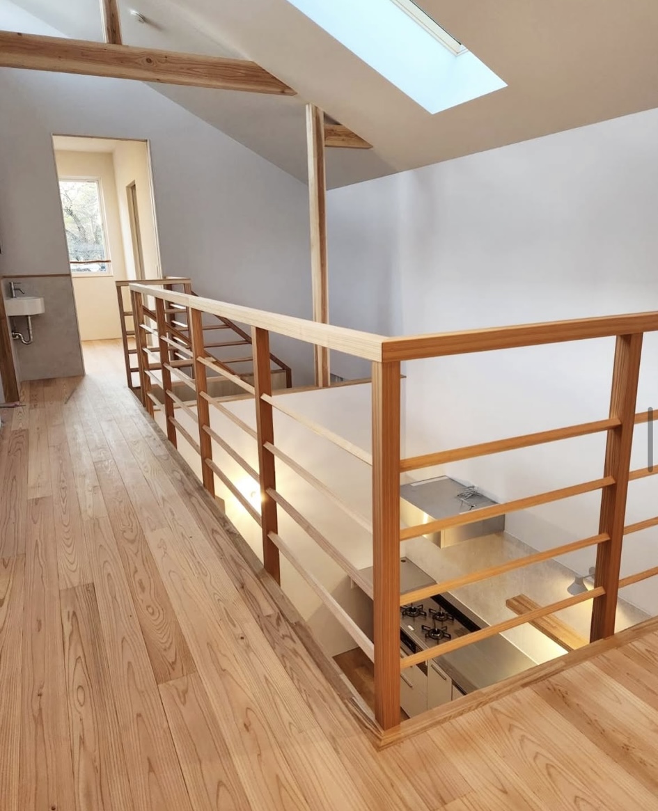 表しの構造材に合わせた、手触りの良い木の手摺り。