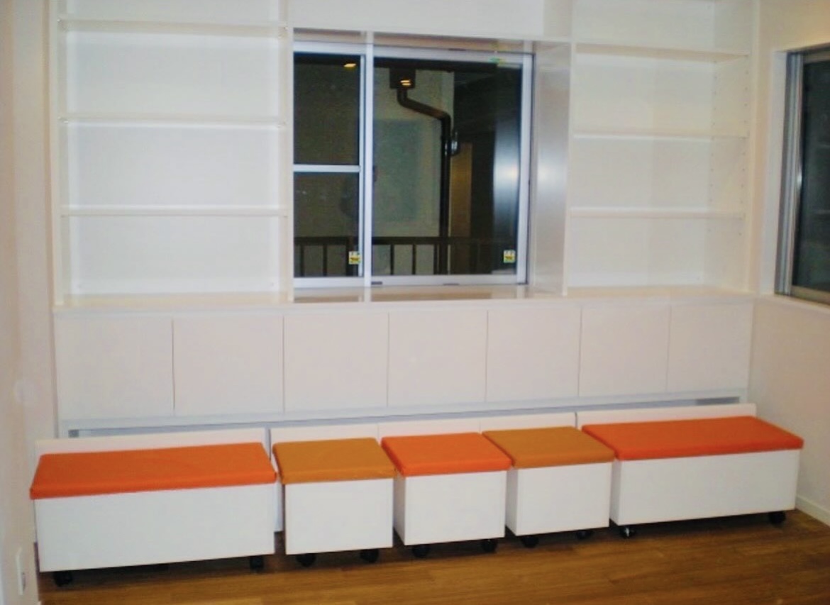 壁面収納とアクセントになるキャスター付きベンチ収納は、収納兼スツールという一台二役の優れもの。