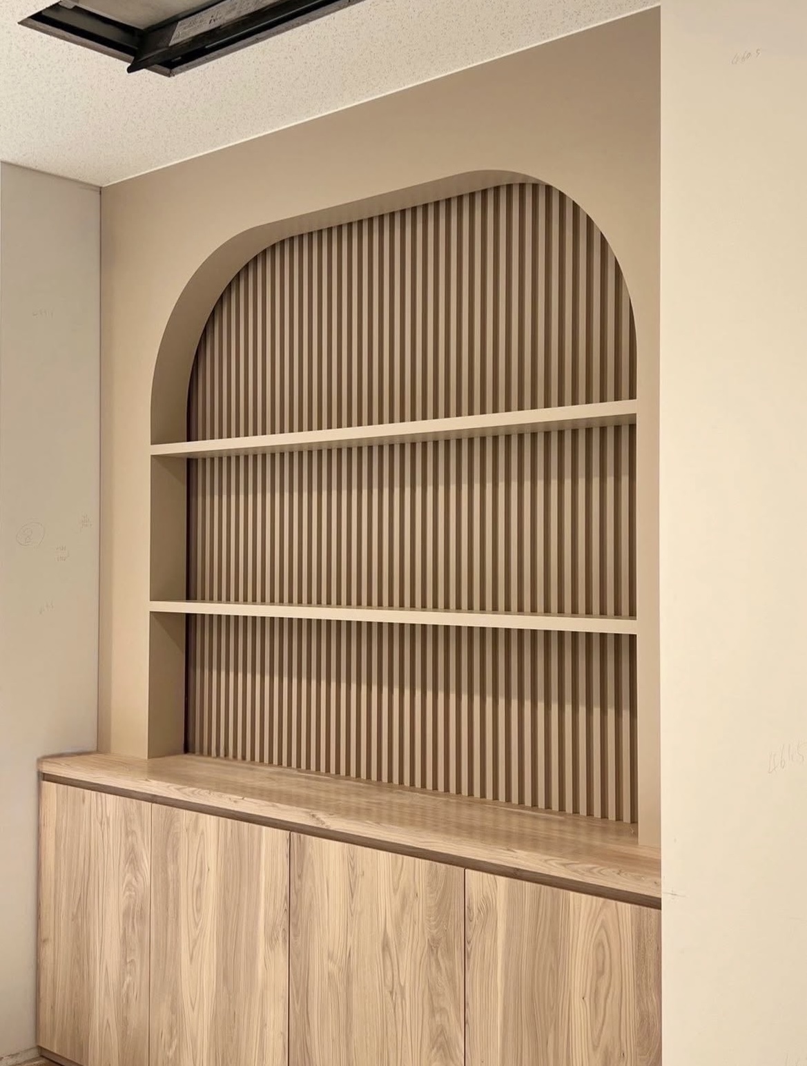 アーチニッチとリブパネルの造作収納。隠せるカウンターと飾り棚で、美しく機能的に。