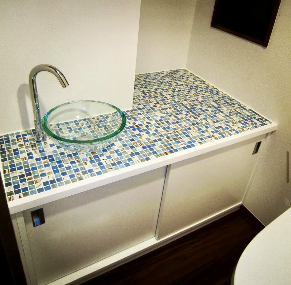 涼しげな水色を基調としたガラスモザイクタイル仕様のトイレ手洗いカウンター。